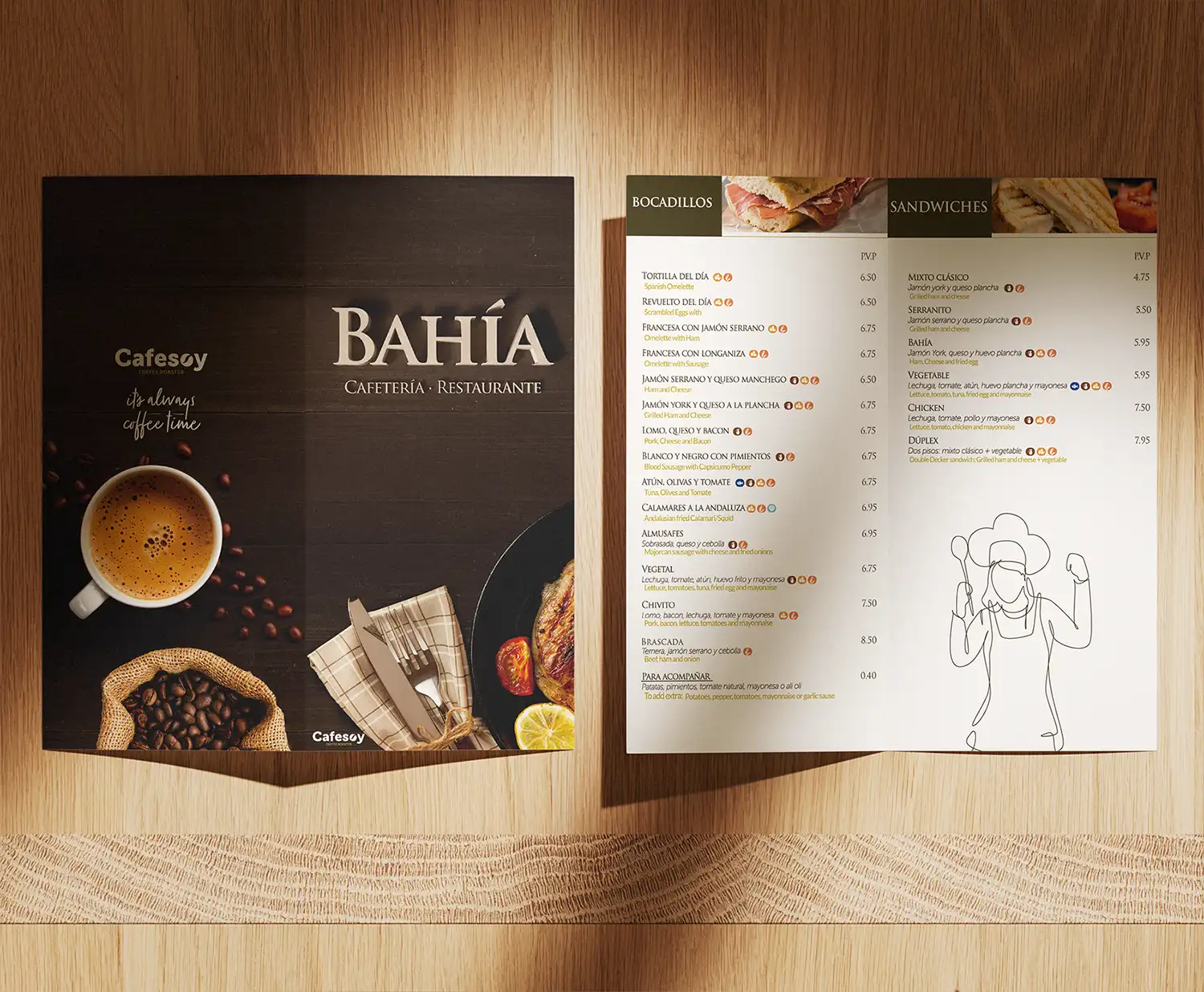 En este proyecto de diseño gráfico trabajamos en la mejora y consolidación de la imagen corporativa de Cafetería BAHÍA, una marca con varios locales en el centro de Valencia.
