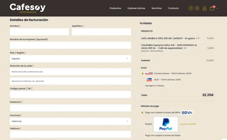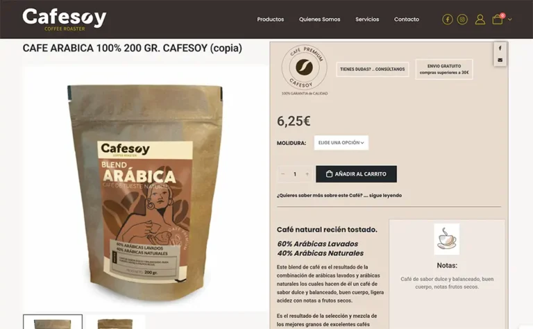 Nuestro estudio de diseño web en Valencia ha desarrollado una tienda online profesional para la empresa CAFESOY especializada en la venta de cafés de especialidad, cafés de origen, así como tés, infusiones, cafeteras y accesorios.